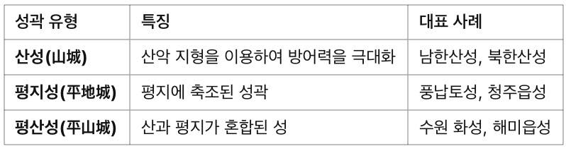 💡 Tip: 한국은 산이 많아 산성이 발달했으며, 삼국 시대부터 산성을 적극적으로 활용했다.