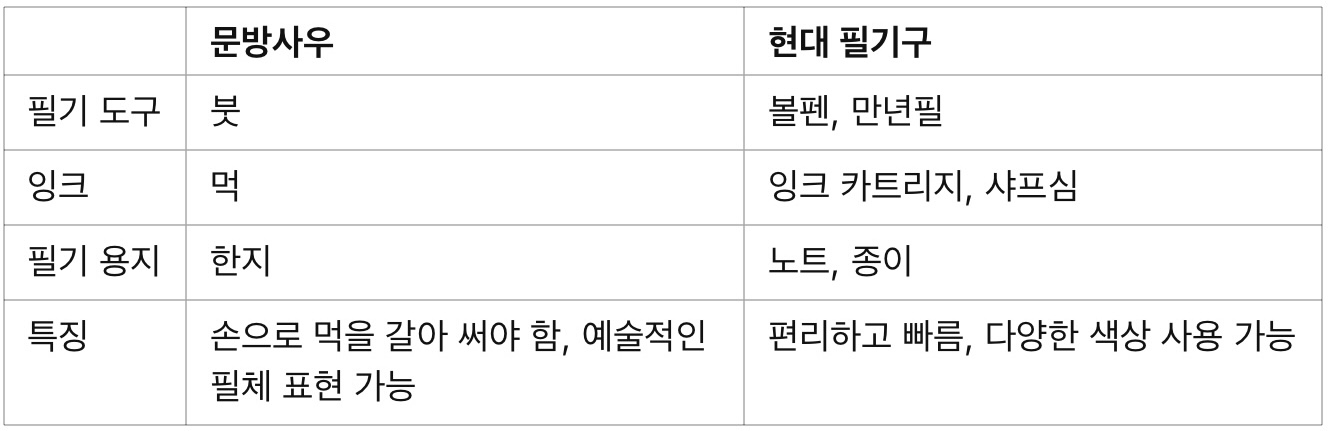 하지만 과거에는 볼펜이나 노트 대신 **문방사우(文房四友)**라는 전통 필기 도구가 있었습니다.
