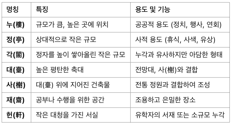 이처럼 누정은 규모와 기능에 따라 다양한 명칭으로 불렸으며, 조망, 휴식, 정치적 활용 등 다채로운 기능을 수행하는 공간으로 활용되었다.